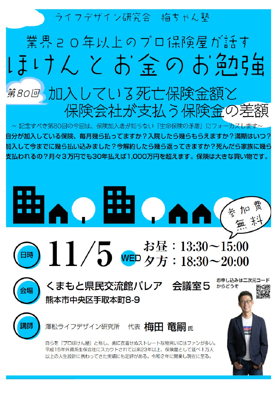セミナー 第80回 ライフデザイン研究会 ~梅ちゃん塾~ いまさら聞けない『ほけん』と『お金』の勉強会 毎月第1水曜日 お昼と夕方二回開催 ライフデザイン研究会 『梅ちゃん塾』 記念すべき!! 第80回 は 令和7年11月5日 の水曜日です!! え?! 何で保険金がこんなに少な... 2025.10.15 セミナー